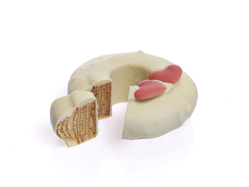 Mit weißer Kuvertüre überzogen und mit Schokoladenherzen dekoriert – für Geburtstag, Muttertag, Valentinstag, Frauentag oder einfach so, eine herzliche Gaumenfreude.