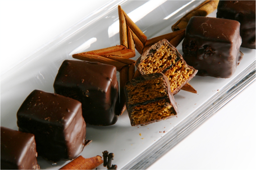 Zwei Lagen feinster Honiglebkuchen zwischen denen sich hausgemachte Rotfruchtkonfitüre befindet. Die von Hand geschnittenen Rechtecke werden mit edler Zartbitterkuvertüre überzogen.