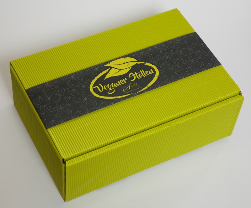 Unser kleiner veganer Marzipanstollen ist liebevoll in Folie eingeschlagen und in einem hellgrünen Präsentkarton verpackt.